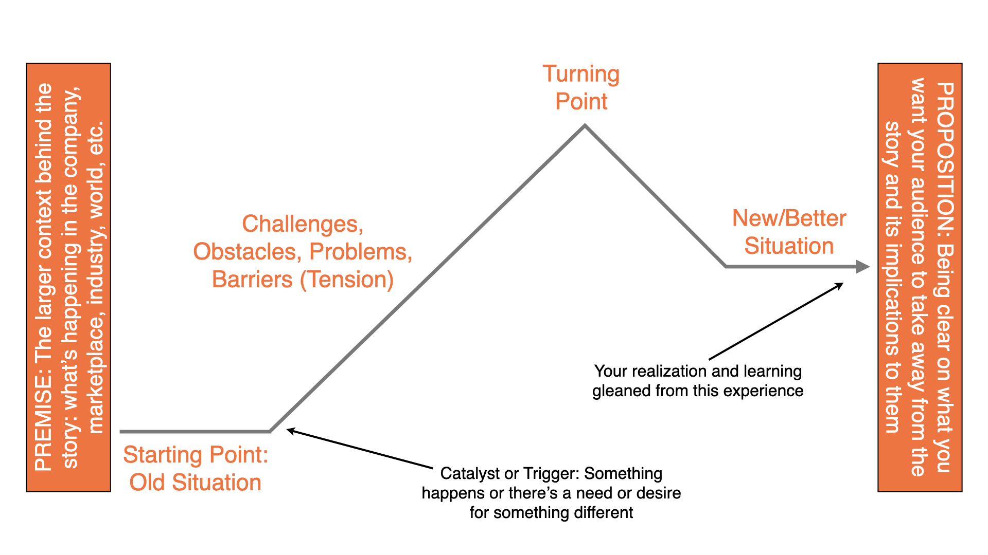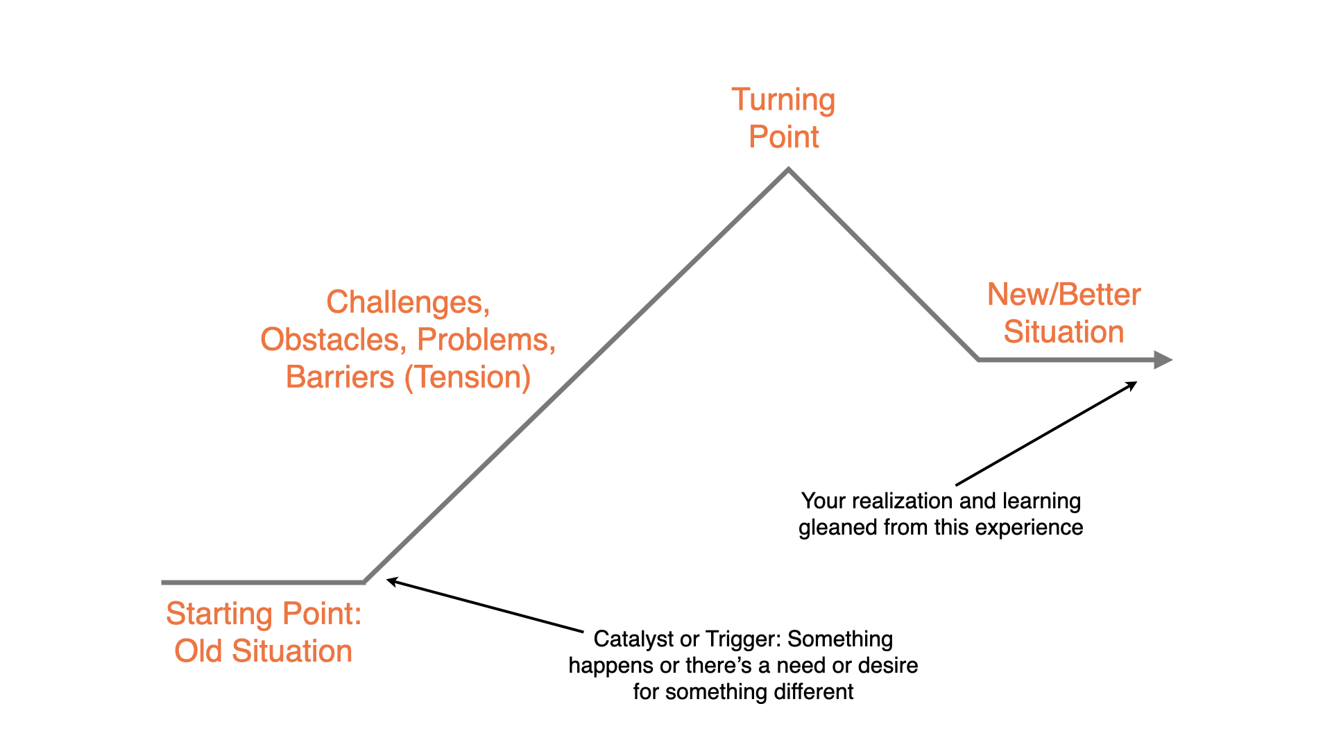 New Situation and Learning from It — What life looks like after the turning point and how it’s somehow better than before (the “after” situation). Importantly, this part of the plot drives towards the wisdom, realization, or learning the storyteller gleaned from the experience: the point they’re making with the story.